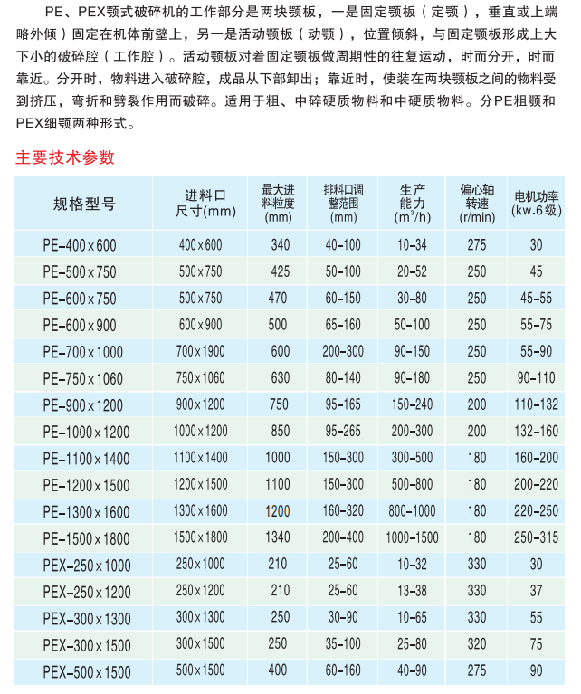 【產品簡介】新型顎式破碎機是出現較早的破碎設備,因其構造簡單、堅固、工作可靠、維護和檢修容易以及生產和建設費用比較少,因此,直到現在仍然廣泛地在冶金、化工、建材、電力、交通等工業部門。(注:PE為粗顎式破碎機,PEX為細顎式破碎機。)